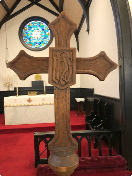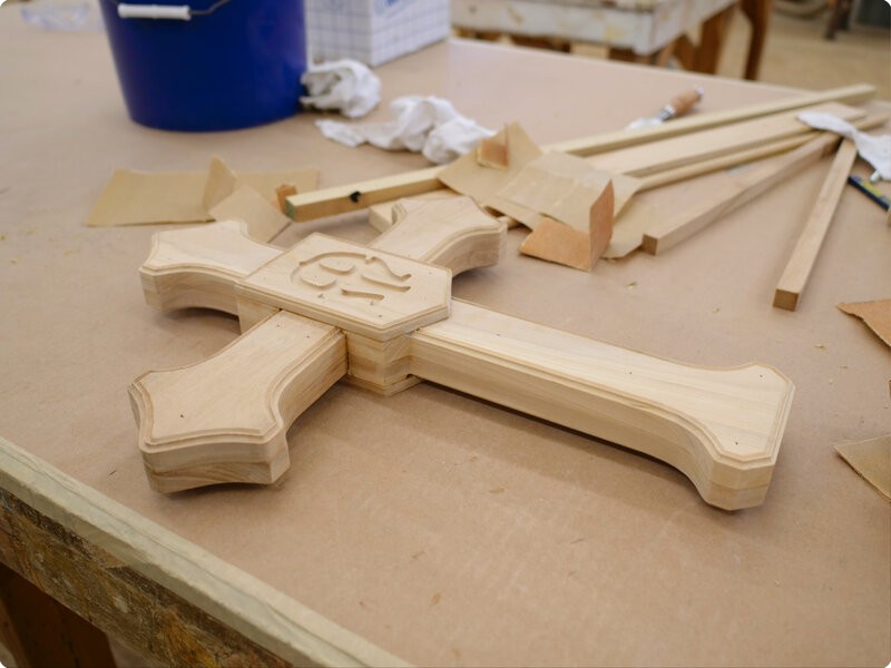 As long as you have the right equipment and materials, it’s not too difficult to recreate something that was lost. In this case, a wooden processional cross was constructed based off the designs contained in old photographs.