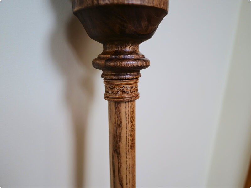 After the ring with the inscription was fabricated, the processional cross had all of its necessary parts. These were coated in a rich, brown wood stain to give them some color. To create a pleasing sheen, the components are then covered in a satin glaze. The coatings need time to bond with the wood. As such, a curing time lasting between one to three days is required depending on the type of compounds that were applied.