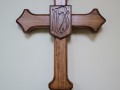 Both faces of the original cross possessed a shield emblem. These emblems each bore a symbol (the IHS and Omega Cross respectively) that represent Jesus Christ. Both designs are stylized to the point where it is tricky to accurately recreate them by hand. As such, we opted to digitally trace the old photographs into the software of a carving machine. This tool cut the replicas of both emblems out of a wooden board. Afterwards, the emblems and beams were assembled into a proper cross.