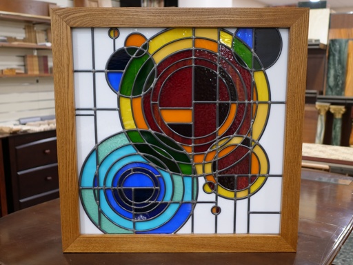 After the design was finalized the window was created in our glass studio. The complex design required several small segments of glass to fit into the crevasses surrounded the overlaps between the large circles and dividing lead lines. In total 130 pieces of colored glass were used to create the window. A custom wooden frame would support the stained glass, as well as house a custom light box to allow the window to be used in spaces without natural sunlight.