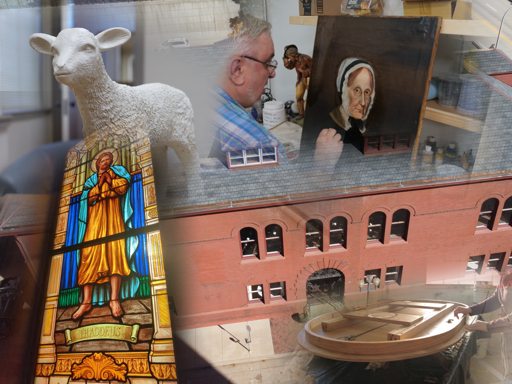 A window of Jesus Christ the Good Shepard is in storage prior to a restoration.