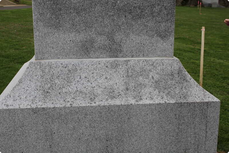 A graffitied monument partway through its cleaning.