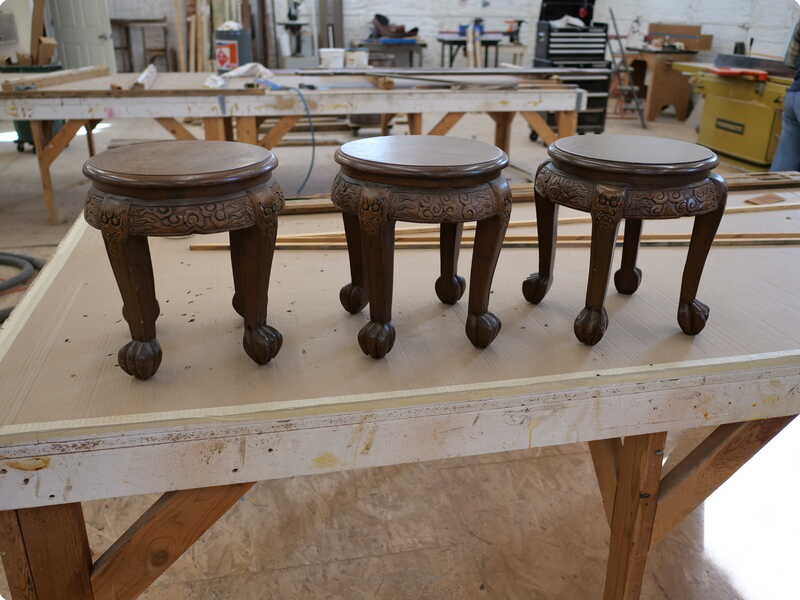 Three oriental stools getting repairs and refinishing.